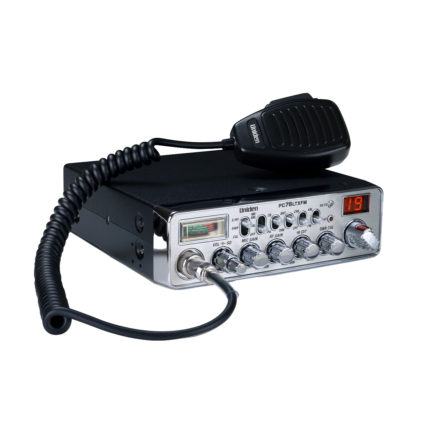 The Uniden PC78LTXFM is the new dual-mode AM/FM transmit and receive CB Radio from Uniden. The performance enhancement features include an integrated SWR Antenna Calibration system that allows the user to calibrate the vehicle’s antenna system for optimum receive and transmit performance. Additional features include Antenna Warning LED, RF Gain and Mic Gain, Hi Cut Noise reduction, Automatic Noise Limiter, and a PA System.